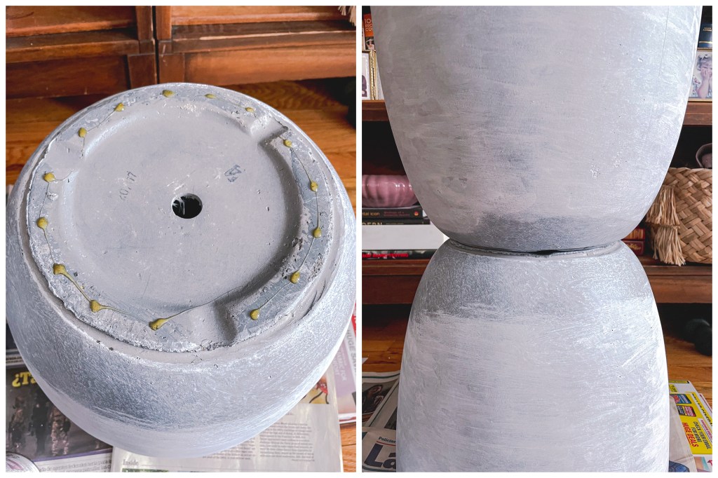 Once the glue under the felt pads has dried, flip over the base and put small dots of glue on the top. You can see the planters I chose have a rim (at what used to be the bottom) so this is where I placed the glue, otherwise place the glue at the spot where your planters will sit on each other. Place the other planter on top of the base and line them up as evenly as possible.