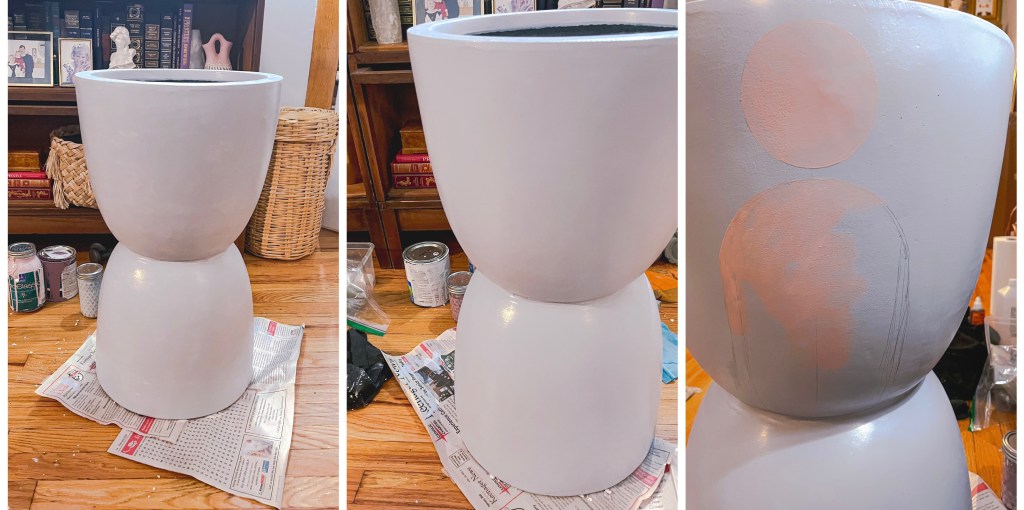 I also wanted to create a geometric design on the top front of the planter. I actually used candle lids and a pencil to trace the circle and the top of the arch and a ruler for the rest of the arch (not a perfect plan, the curvature of the planter made it difficult). If you want to do anything super intricate I would recommend having artistic skill and a steady hand (lol) or a really good stencil.