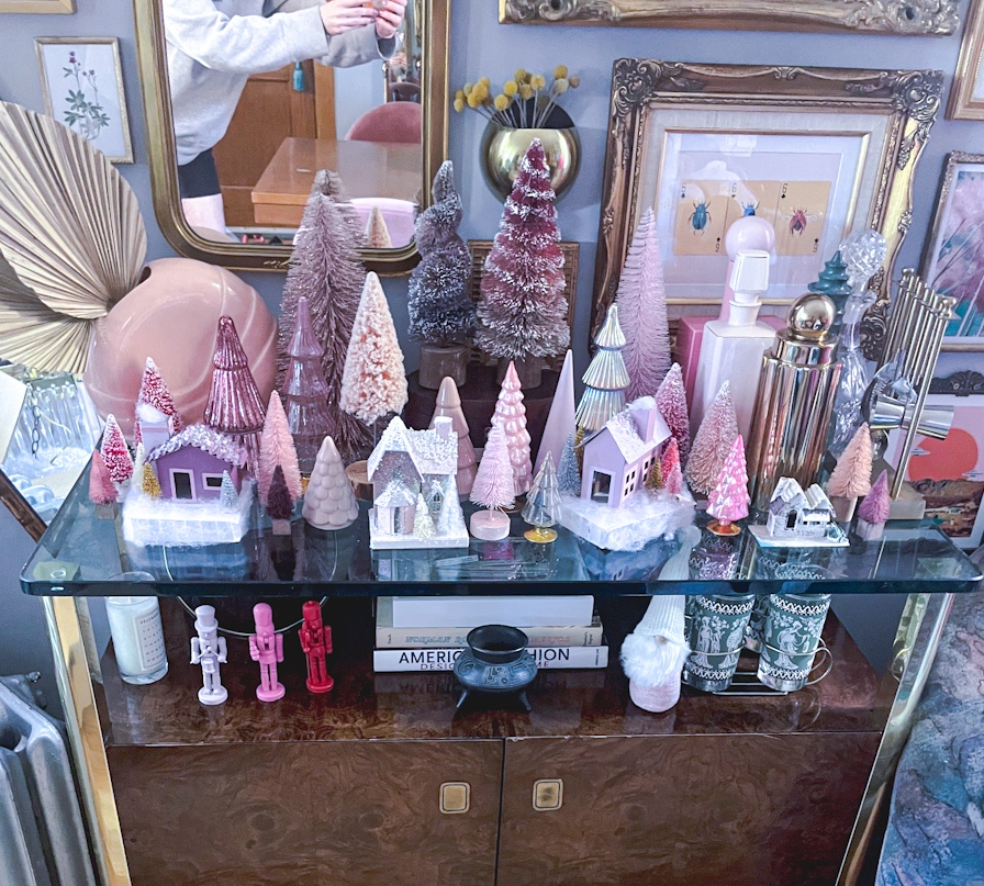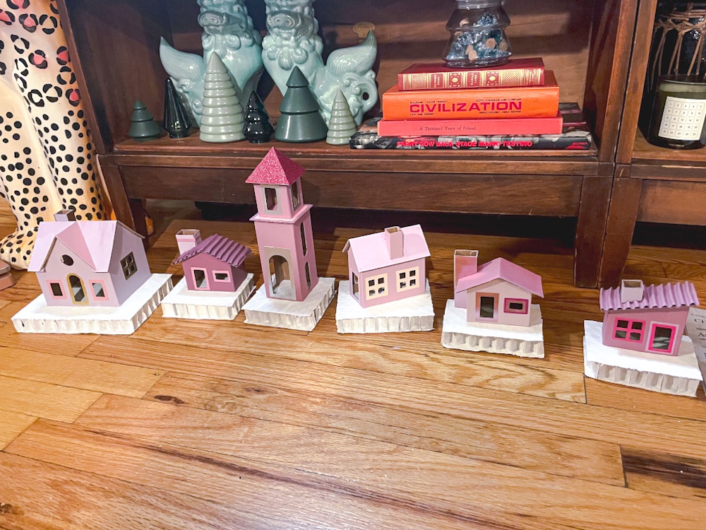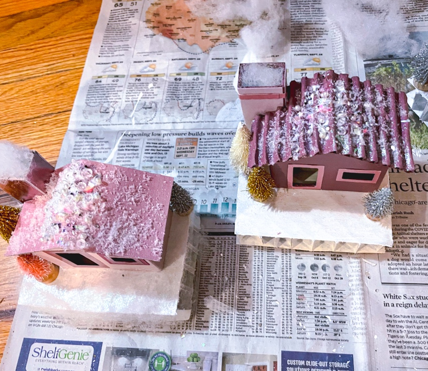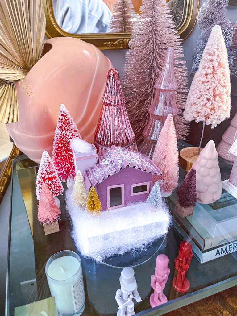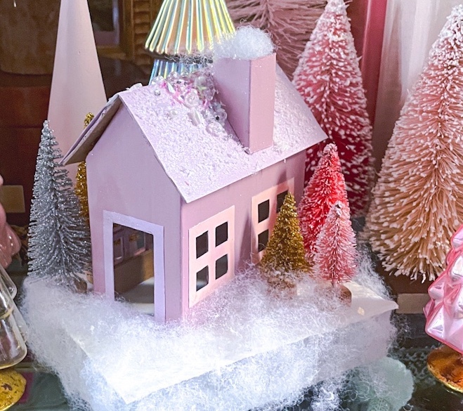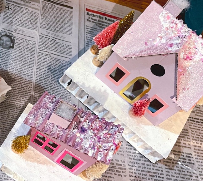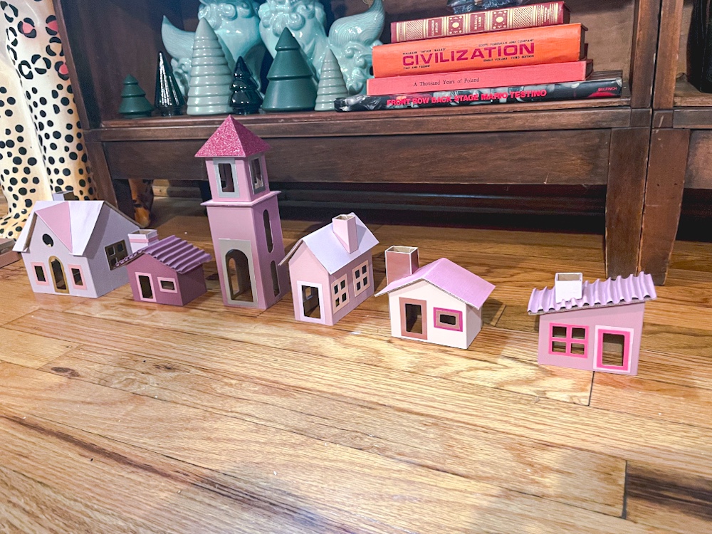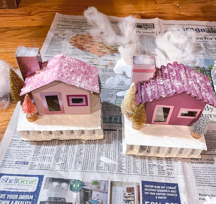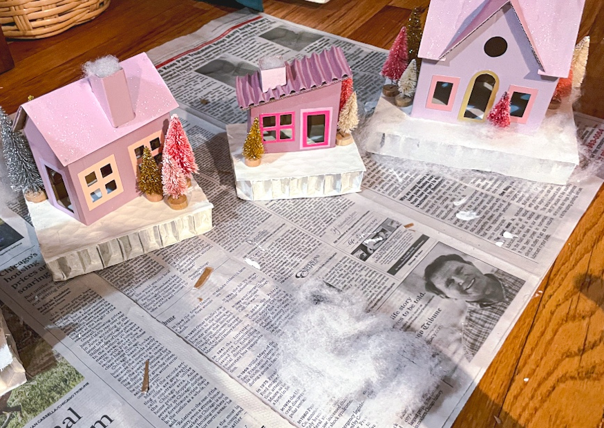 The houses are now complete! I paired with some putz style houses I already had, as well as large bottle brush, glass, and ceramic trees all in various shades of pink to create a holiday village that shines. As always, please share photos of your creations if you decide to make your own!
