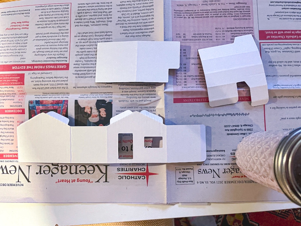 I used corrugated fiberboard to make the bases of my houses, but any thick cardboard should do. I cut the pieces so they would be a good size/shape depending on size/shape of each house as some are bigger than others. I then painted the bases white to look like snow.