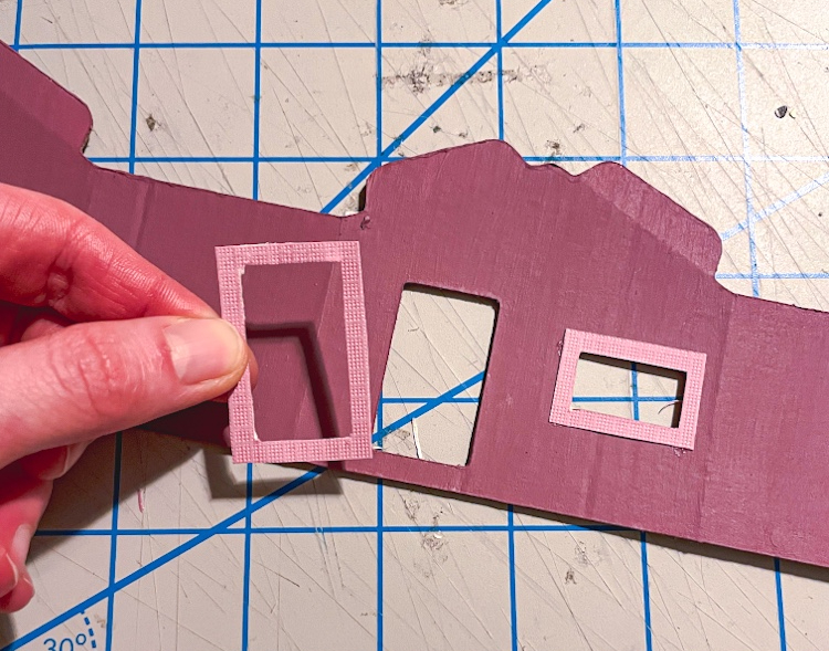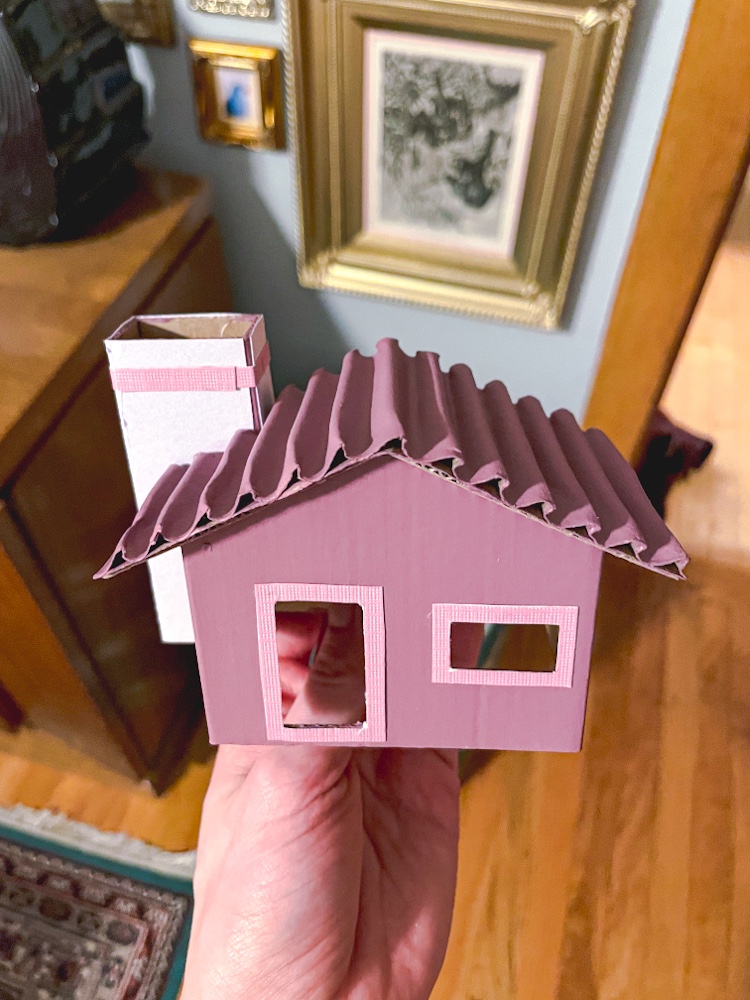 Glue the window and door frames to the house before assembling. You can also add paper to walls, chimneys, or the roof – just trace out the shape using the cardboard house piece as a guide. You may also use corrugated cardboard on roofs to make texture that looks like shingles.