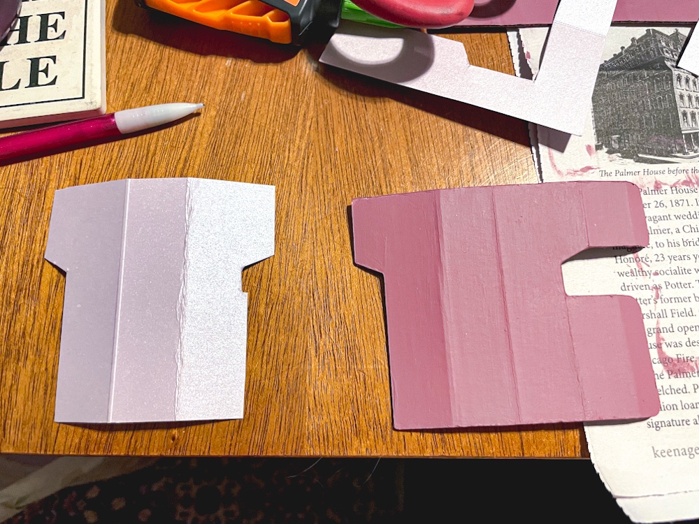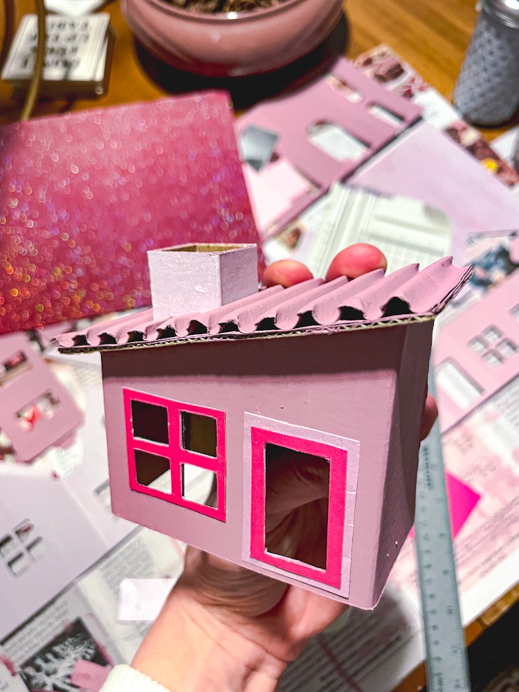 Paint your cardboard house cut outs in whatever colors you wish – I chose pink of course! For each house I painted all the pieces the same color, but feel free to mix it up. I used different shades of the same color to have a cohensive look since I planned to display the houses all together, but again, the colors are up to you.