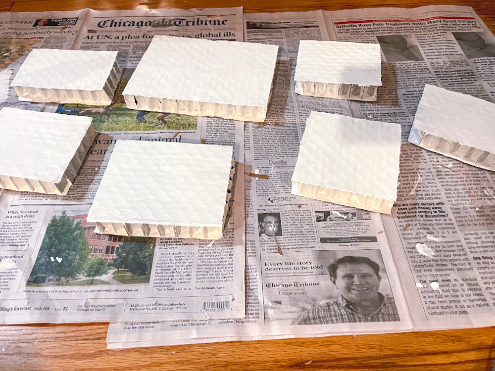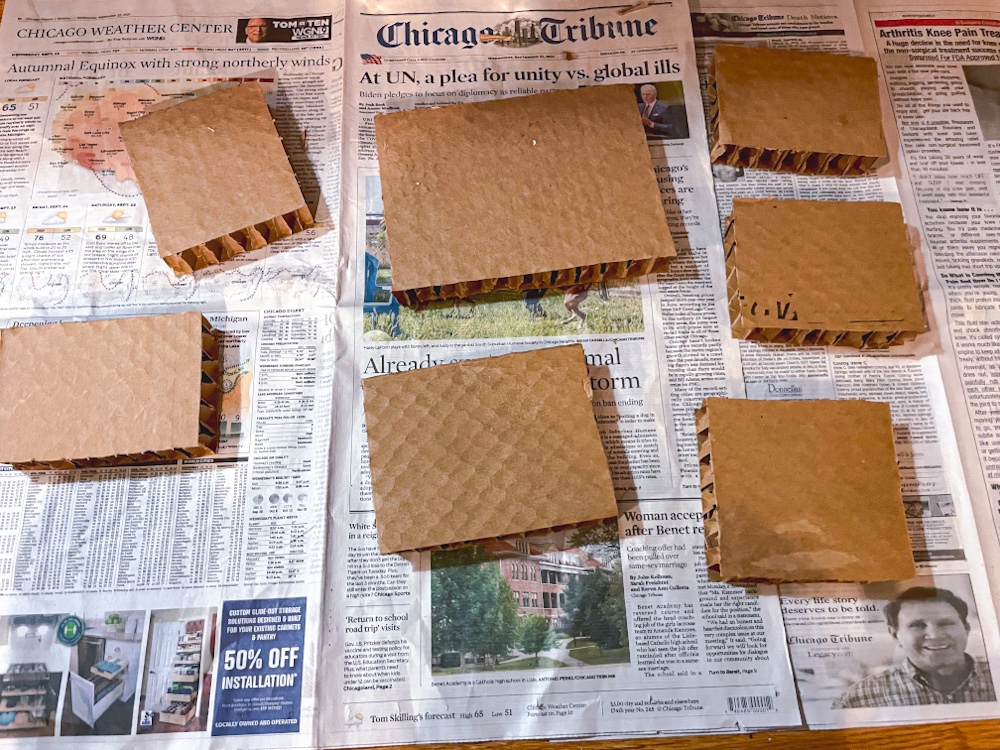 - Corrugated Fiberboard for the house bases (you can also use a different form of sturdy, thick cardboard or layer multiple pieces): I used extra thick corrugated fiberboard from packaging I had saved from something I ordered in the mail (gotta love sustainability!!).