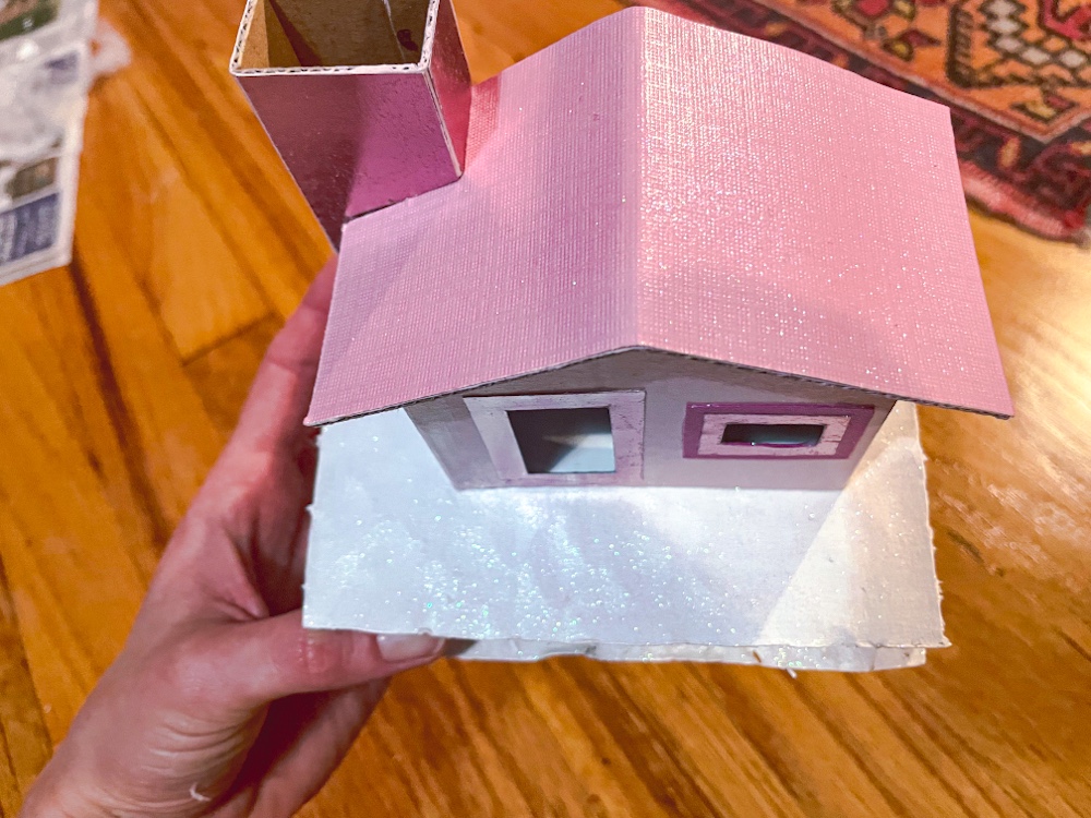 Glue each house to the base. Then using glitter paint or glitter mod podge, paint a layer or two over the whole house and the base to give it a snowy sparkle.