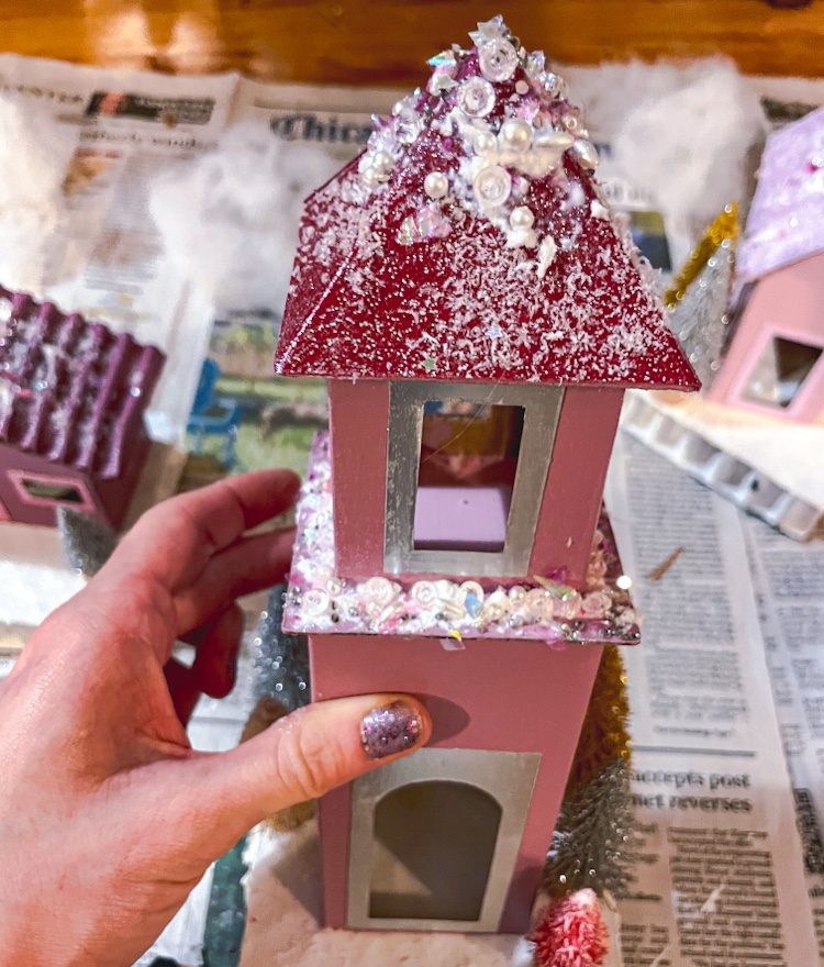 For some extra pizzazz and glamour you can sprinkle beads, glitter, sequins, and other embellishments on the top of the roof over the snow. In order to get heavier items to stick, I poured glitter paint onto the roof directly from the bottle and spread it on the top just slightly with a paint brush, keeping the coverage thick before sprinkling the embellishment items on top.